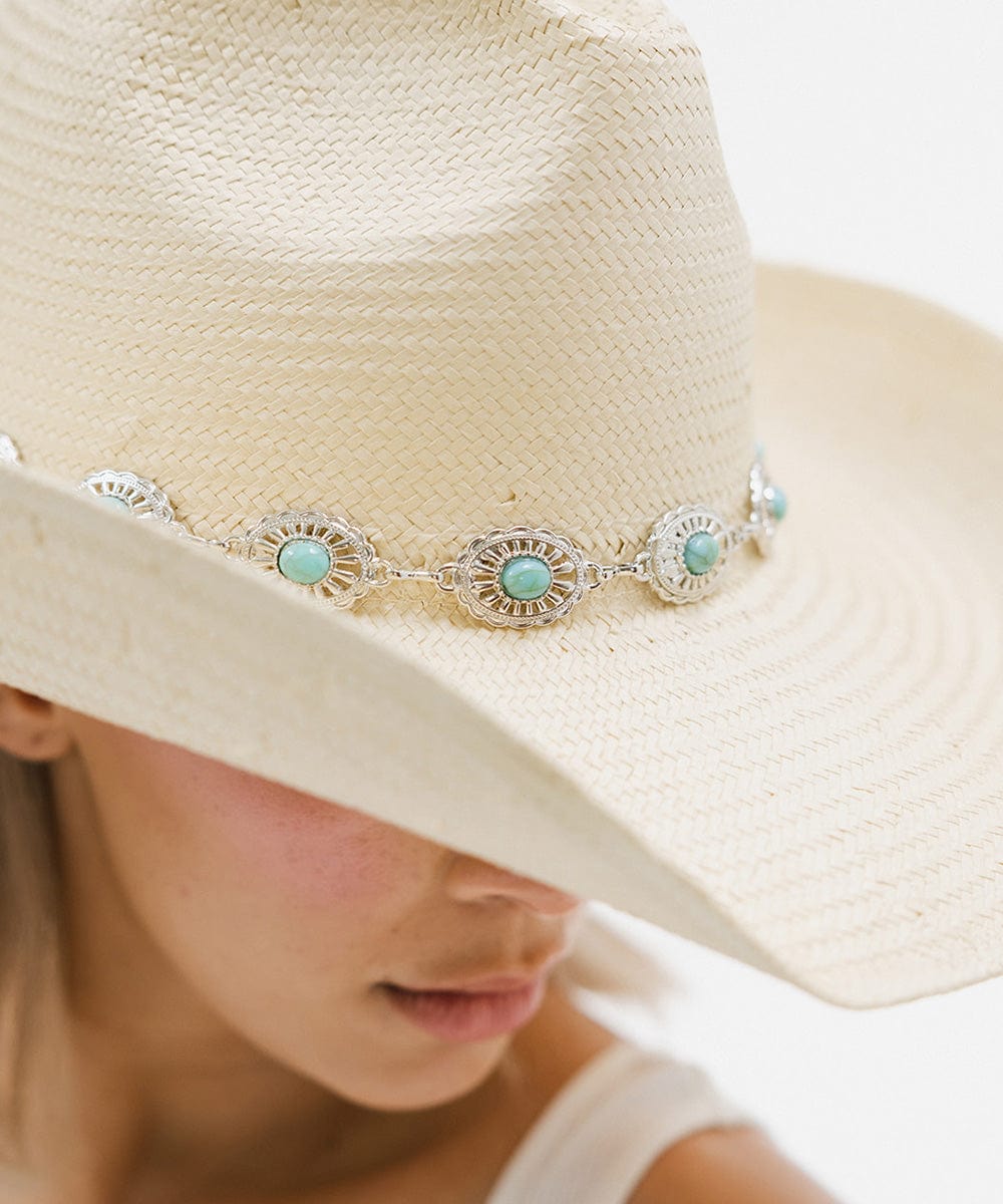 Tap into your coastal cowgirl era with the classic Turquoise Concho band. Featuring a classic oval concho shape with a turquoise pendant + an adjustable chain closure for a customized fit. This band was made to trim your felt + straw hats for a classic Western touch.