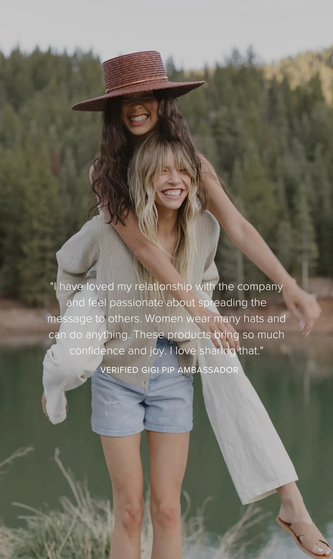 Want to share your love for our hats with all your friends + family? Join our ambassador community + show off all the hats you wear as a Gigi Pip lover. Gigi Pip Ambassadors have the opportunity to earn commission on sales + get points for participating in campaigns. Points can be cashed in for rewards such as free product, personal-use discounts + gift cards! Other exclusive perks included! Don't miss out!