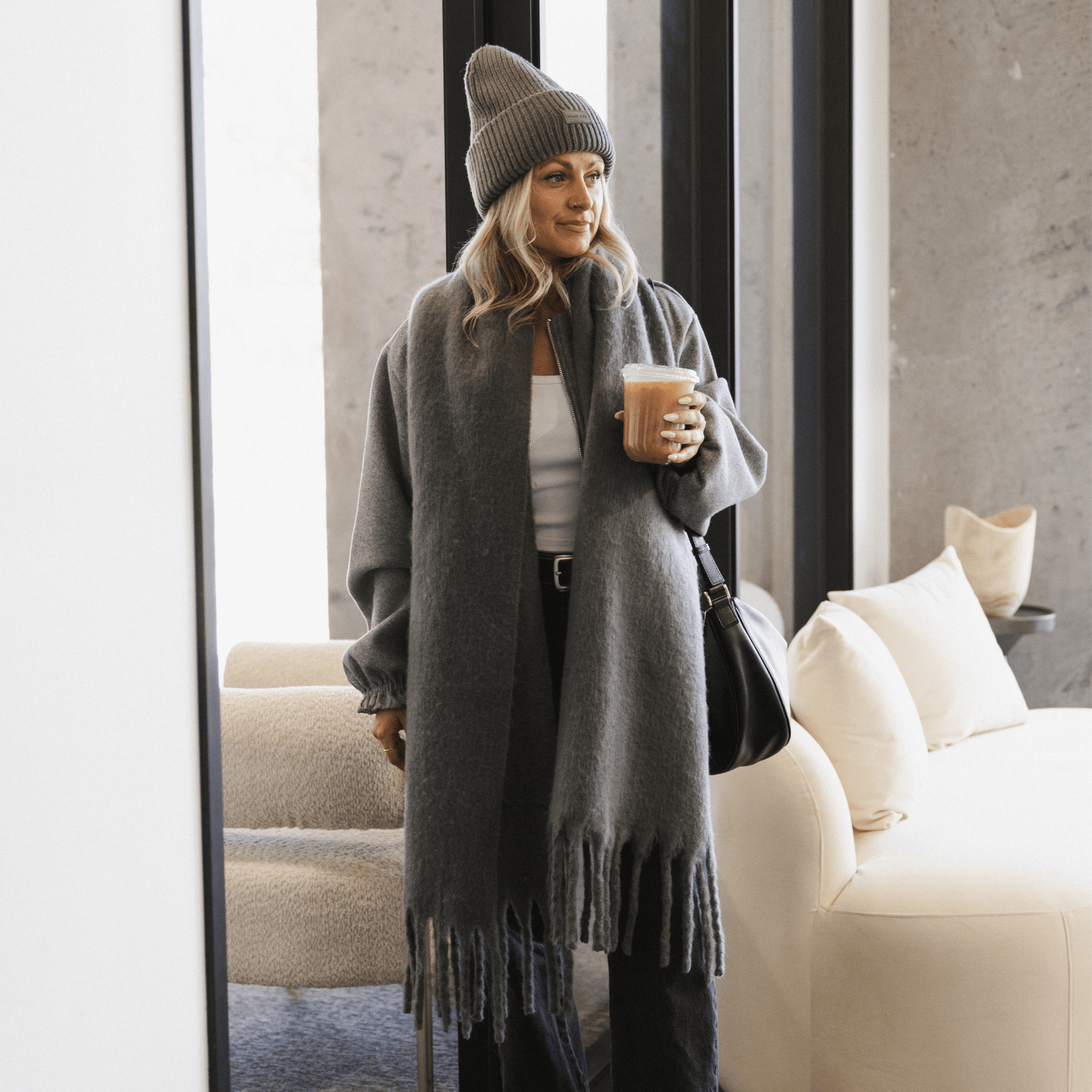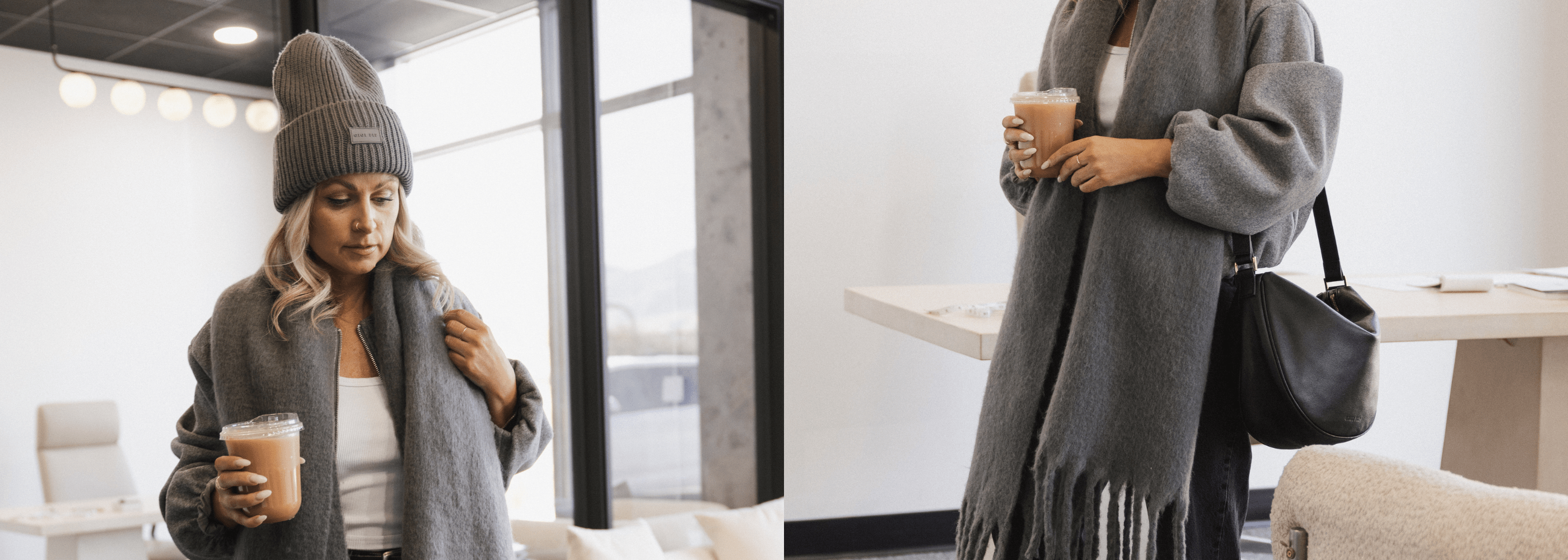 “Blazers are always a classic staple fashion item for me! This season, I’m loving brown + green tone blazers paired with a trucker. I’m also loving bomber jackets, button-downs, pleated mini skirts paired with a sweater, denim on denim, and a good cozy beanie—it’s a must this season!”