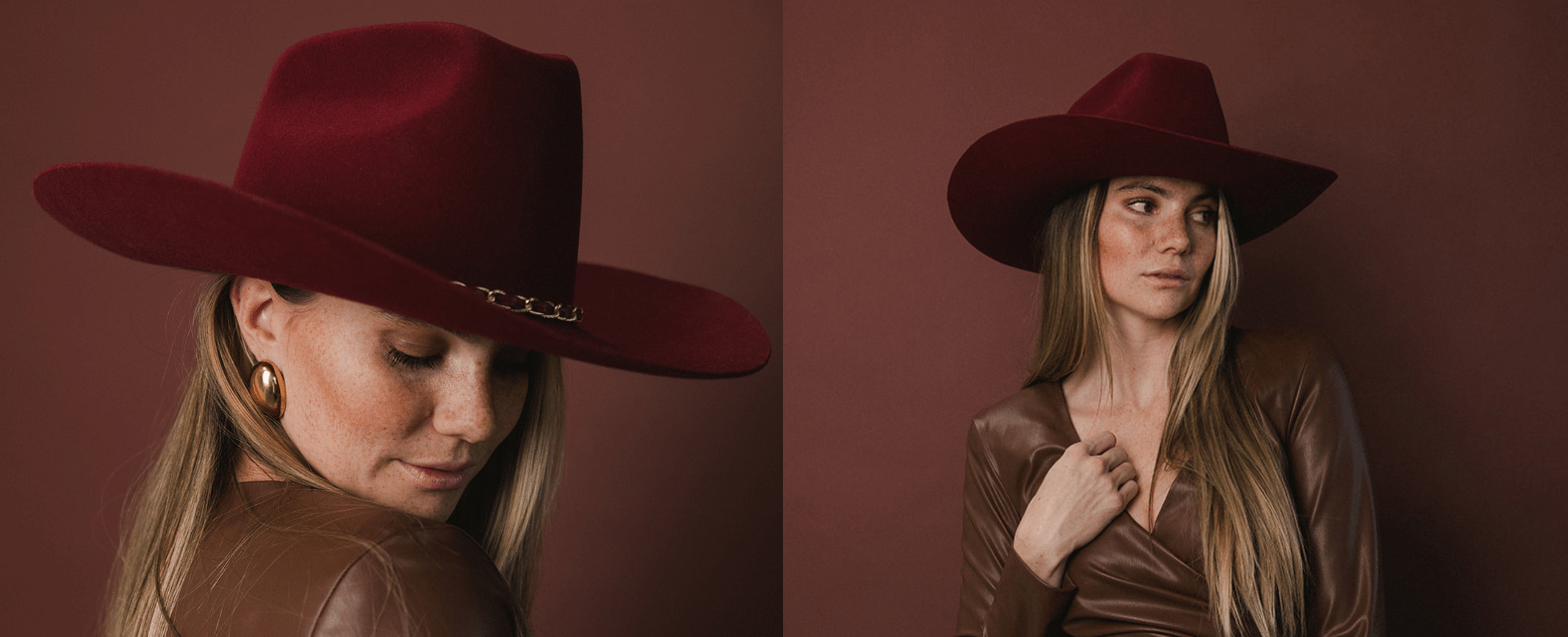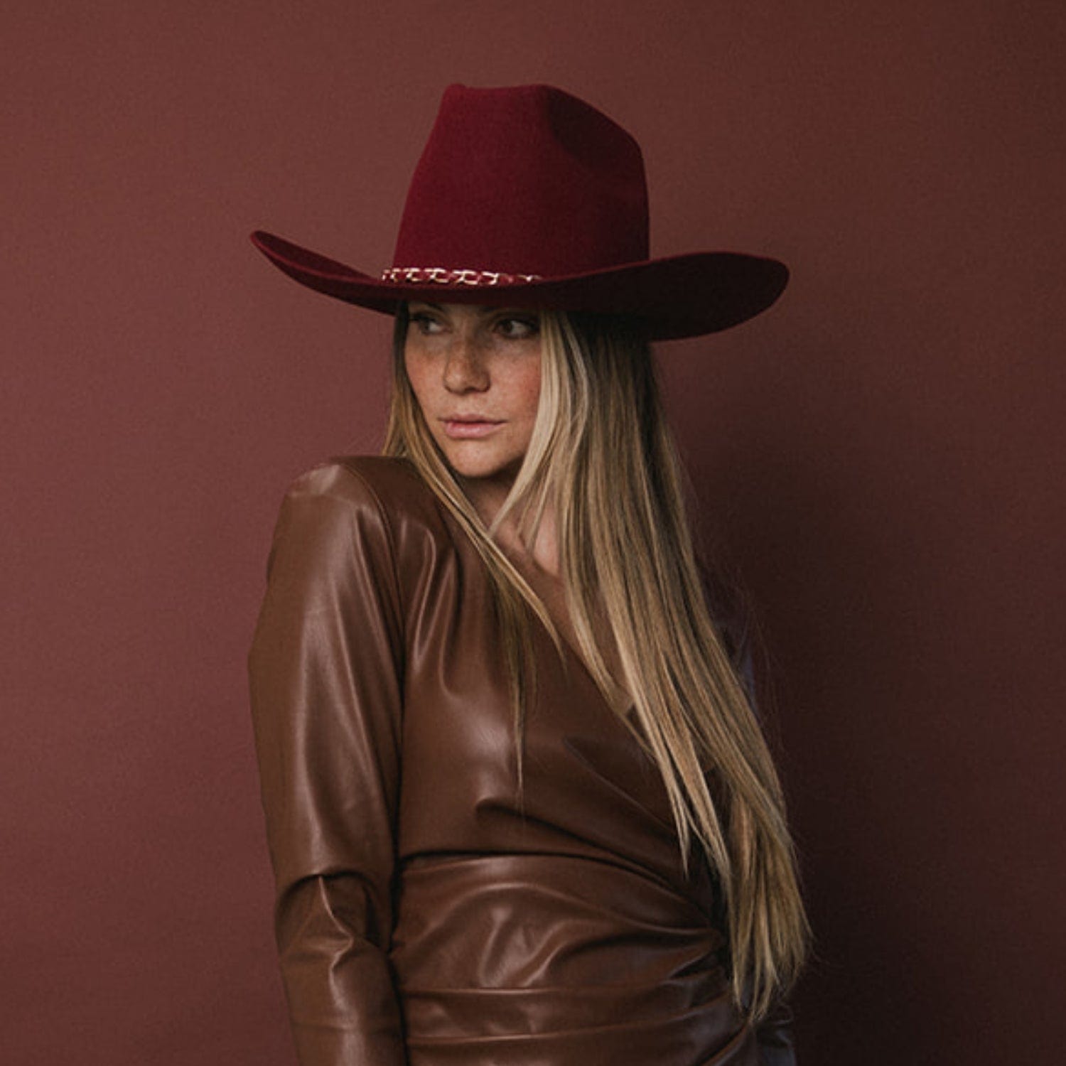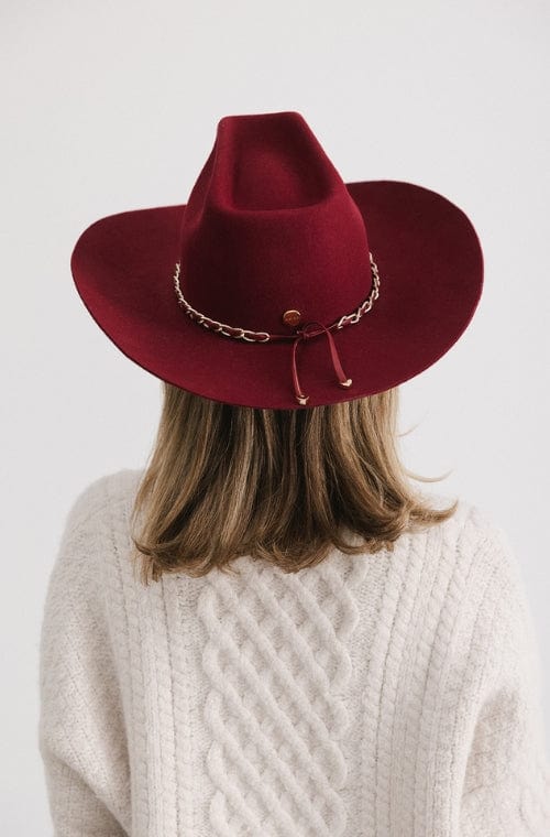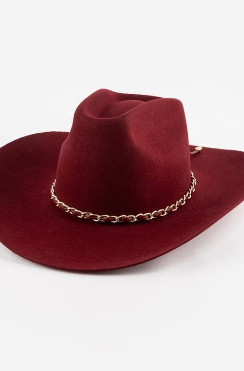 This stunning Burgundy color is sure to make a statement. To elevate the look even further, this design also features a tonal burgundy leather hat band intertwined with a gold chain creating a perfect blend of western style + glam. A color + trim exclusive to this design!